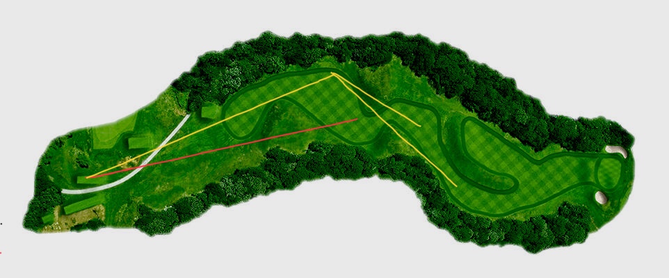 A shot up the left hand side (yellow line) hands a poor angle and blind shot over the left mound that makes for a much more difficult layup. One of the hole’s more subtle features is the diagonal fairway. The left side allows shorter players a safe route while penalizing longer players who play safe.