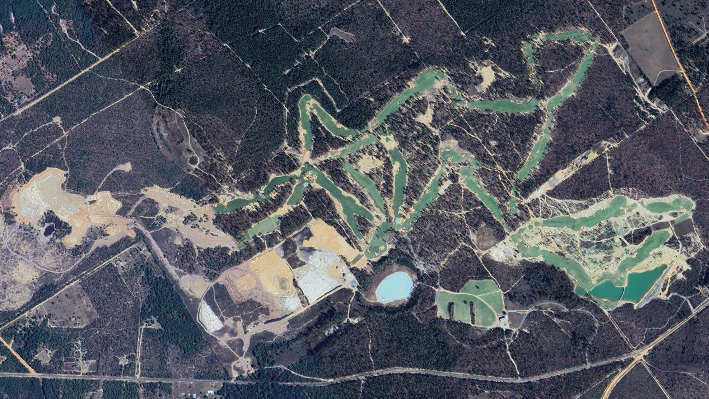 Google Earth has November 2023 imagery of the progress at OCM’s Fall Line, a 36-hole private club in the Georgia sandhills scheduled to open this year. Already apparent is the stylistic distinction between the courses: the mostly finished 18 on the east half of the property has rustic bunkers reminiscent of those built by Harry Colt in the English heathlands, whereas the in-progress course on the west side bears an obvious Australian Sandbelt influence, with billowing, clean-edged bunkers jutting into the fairways and greens.