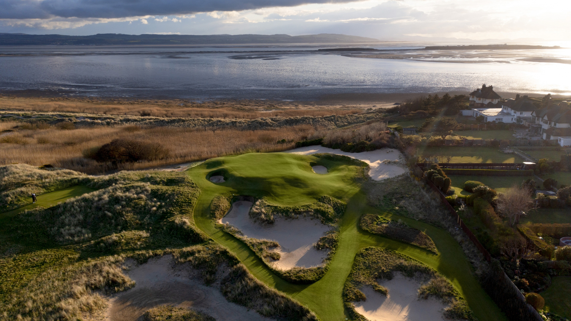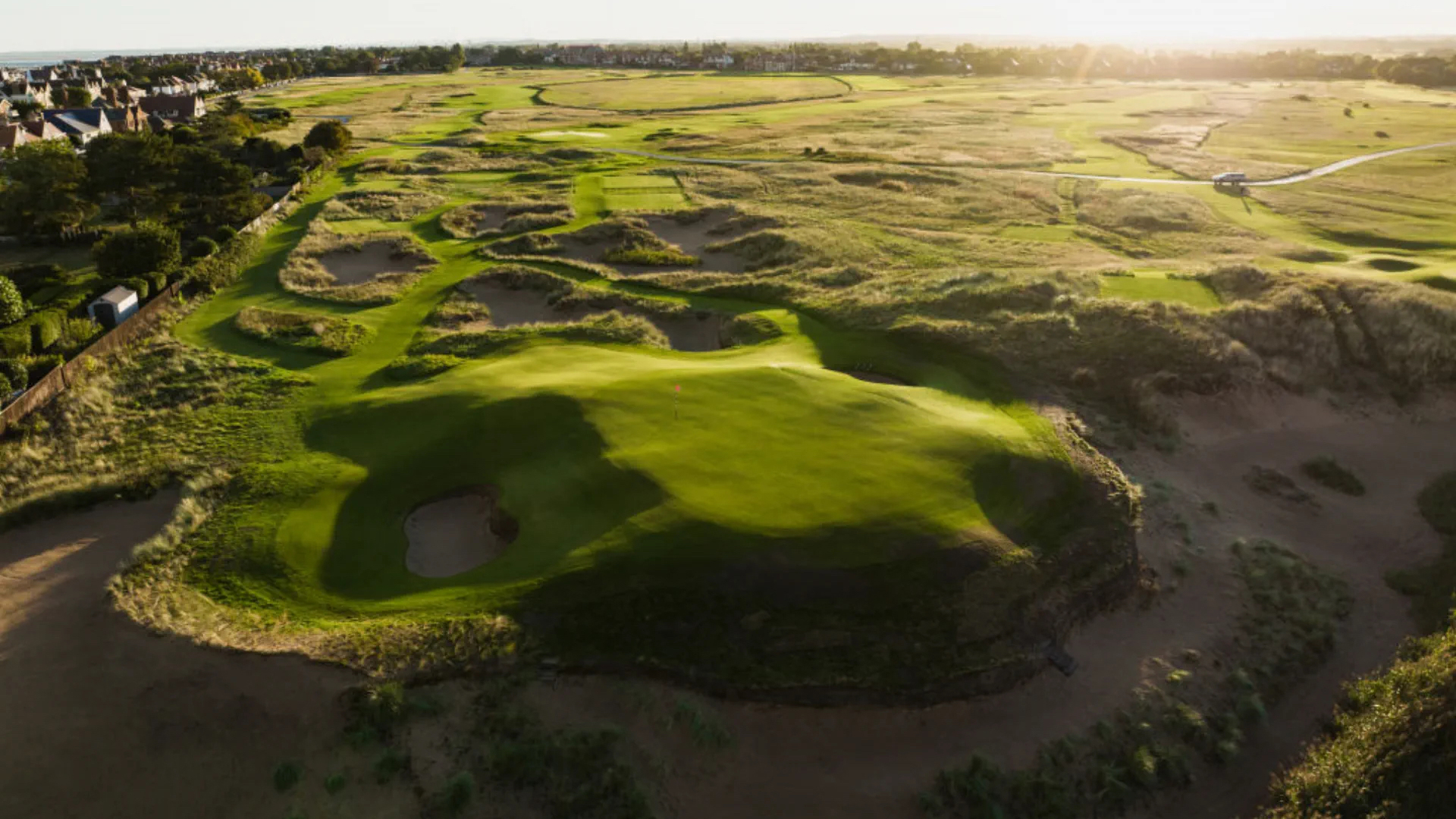 Between the mid-1920s and Ebert’s redesign, the par 3 played as No. 13 for members. It faced away from the Dee Estuary, starting from a tee in the dunes and finishing at an inland green originally established by Harry Colt. As part of his work in 2020, Ebert reversed the direction of the hole. Now it fits into the routing differently, playing as the member 15th and the championship 17th, and travels toward the water, creating an attractive tableau for drone photographers. For additional visual pop (and ecological friendliness, supposedly), Ebert installed a few of his signature “sand scrapes” between tee and green. The green itself is small and surrounded by bunkers and run-offs—a somewhat less exacting version of Royal Troon’s Postage Stamp.