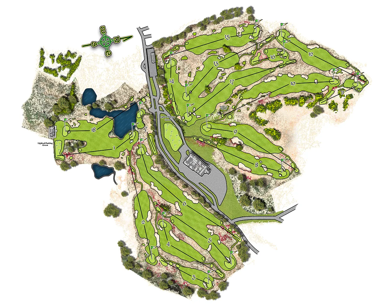 In a novel twist on the reversible concept, Zinkand’s plan calls for side-by-side double greens to facilitate the start and finish of each course. The “white course” begins and ends on the right-hand double green while using a middle pin for hole 8 on the left-hand double green. The “purple course” plays to the left-hand double green twice—on holes 1 and 8—and the right-hand double green only once, on hole 9. (Confused? Spend a minute looking at the map below. It will make sense.) This is a clever, maintenance-friendly solution for what could have been a chaotic section of the property.