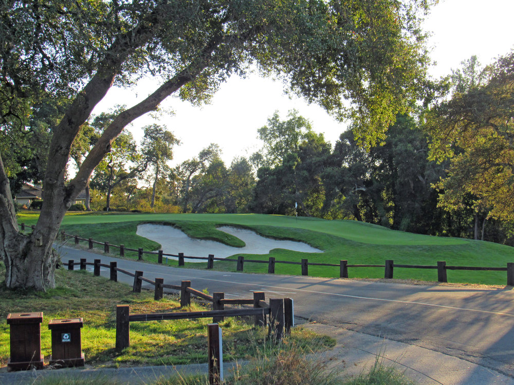 At the public access Pasatiempo, we get to see Alister MacKenzie’s take on the Double Plateau. Like many of Macdonald and Raynor’s holes, the tee shot is blind. A good tee ball will leave a short-iron approach to the severely sloped back to front green complex. Unlike Macdonald and Raynor’s creation, this Double Plateau isn’t an L-shaped green, but rather, a long and narrow one. The slopes make it important for players to control their spin in order to stay on the correct tier and have a good birdie opportunity.