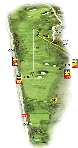 The par-5 6th is an excellent example of the simple principles of great golf architecture. The famed par 5 plays along the property line, which is used masterfully. Out of bounds is the most intimidating penalty in golf. Stroke and distance is a penalty that can cost a player a major championship. A drive down the very left edge of the property gives players the best scoring opportunity on the 6th due to the way the green is angled.