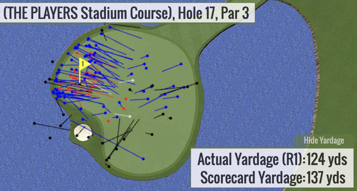 A plot of Thursday's tee shots on 17, featuring plenty of clustering in an area left of the pin that should have seen a lot more balls in the water. (Image: PGA Tour)
