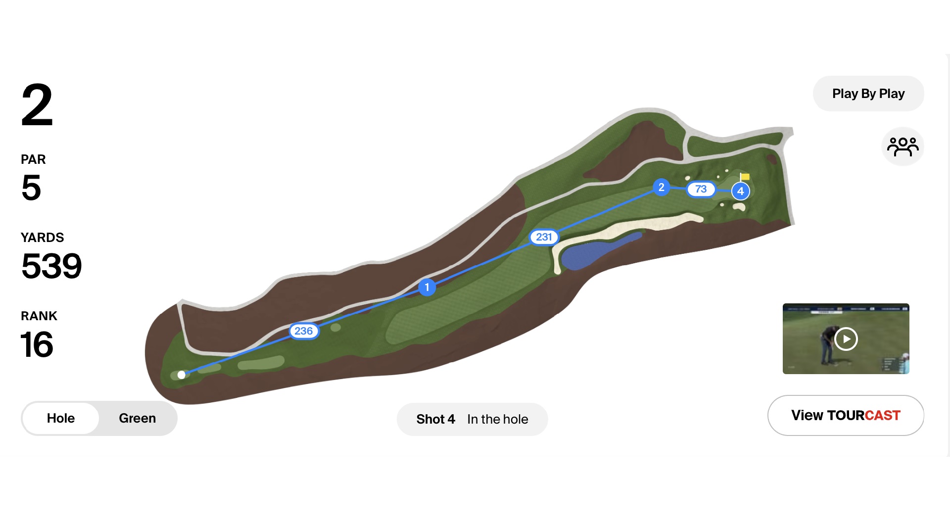 Wyndham Clark's unorthodox route to birdie on 2, demonstrating how he's able to recover from inconsistent accuracy. (Image: PGA Tour)