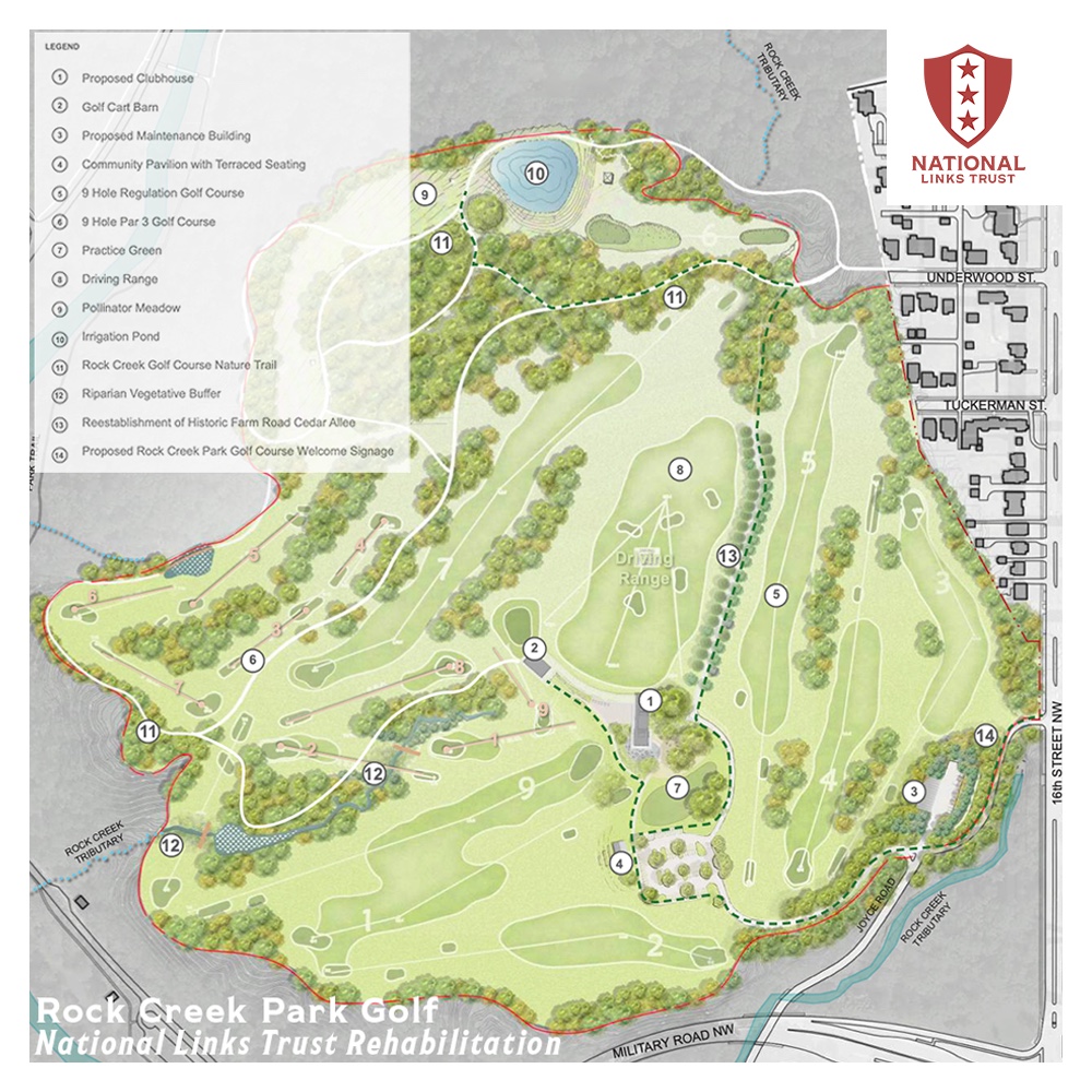 Yesterday, the National Links Trust, a nonprofit that operates three municipal golf courses in Washington, D.C., announced a plan for renovating Rock Creek Park Golf Course. It’s an ambitious proposal, calling for not only an overhaul of the William Flynn-designed course by Gil Hanse and Jim Wagner but also a new clubhouse (housing a regional First Tee headquarters), pavilion, maintenance facility, driving range, short-game practice area, “Himalayas-style” putting course, and system of ecological trails. The NLT estimates that the work will cost $22.7 million and hopes to start work on the buildings this fall.