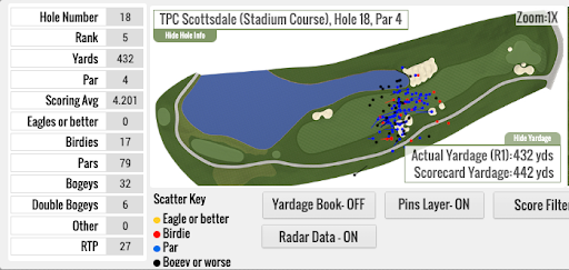TPC Scottsdale is a driver-heavy golf course where the golf ball travels far. If your only goal is to lead the PGA Tour in driving distance, skip Pebble Beach and play here. I think an underrated element of TPC Scottsdale is the degree to which it punishes errant drives. TPC Scottsdale ranks among the most penal tour courses in my database for drives that are a little bit offline. If you miss the fairway by a few yards, you can often end up in a cactus, or on some holes like 11, 15, and 17, a water hazard. Some holes, though, afford you some more room off the tee. On the 18th hole, for example, sometimes you’ll see players rip drives down the right side of the hole, eliminating the water from their range of outcomes. The short rough at TPC Scottsdale means you can get away with finding it down the right-hand side of the hole, and you’ll often get a free drop from the hospitality area lining the right side.